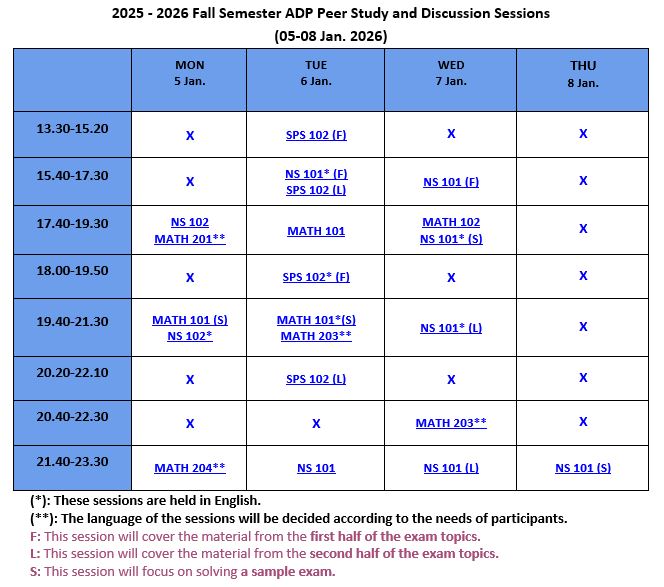 Academic Support Program (ADP/ASP), provides support and guidance in an enjoyable learning environment. The sessions are based on collaboration with your peers and aim to develop your critical thinking, communication, and study skills. You may attend the sessions to improve your academic success in MATH 101, MATH 102, MATH 201, MATH 203, MATH 204, NS 101, NS 102, SPS 101, and SPS 102 courses. Write to us at adp@sabanciuniv.edu for your special needs.