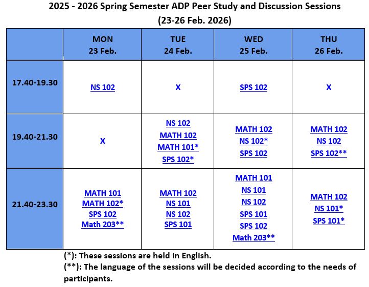 Academic Support Program (ADP/ASP), provides support and guidance in an enjoyable learning environment. The sessions are based on collaboration with your peers and aim to develop your critical thinking, communication, and study skills. You may attend the sessions to improve your academic success in MATH 101, MATH 102, MATH 201, MATH 203, MATH 204, NS 101, NS 102, SPS 101, and SPS 102 courses. Write to us at adp@sabanciuniv.edu for your special needs.
