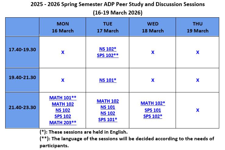 Academic Support Program (ADP/ASP), provides support and guidance in an enjoyable learning environment. The sessions are based on collaboration with your peers and aim to develop your critical thinking, communication, and study skills. You may attend the sessions to improve your academic success in MATH 101, MATH 102, MATH 201, MATH 203, MATH 204, NS 101, NS 102, SPS 101, and SPS 102 courses. Write to us at adp@sabanciuniv.edu for your special needs.