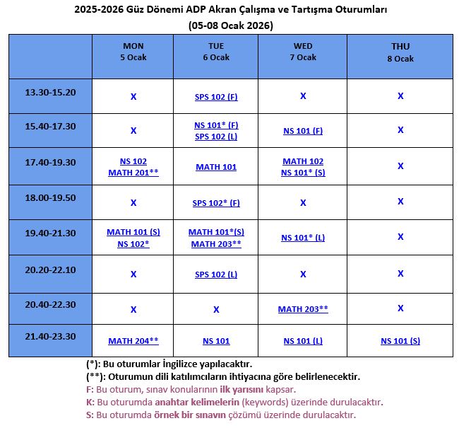 Akademik Destek Programı (ADP/ASP), öğrenme sürecini daha zevkli kılacak, çalışma veriminizi ve başarınızı arttırmaya yönelik oturumlar düzenler. Bu oturumlar, akran dayanışması prensibine dayanır ve eleştirel düşünme, iletişim ve çalışma becerilerinizi geliştirmeyi amaçlar. MATH 101, MATH 102, MATH 201, MATH 203, MATH 204, NS 101, NS 102, SPS 101 ve SPS 102 derslerindeki akademik başarınızı arttırmak için oturumlarımıza katılabilirsiniz.