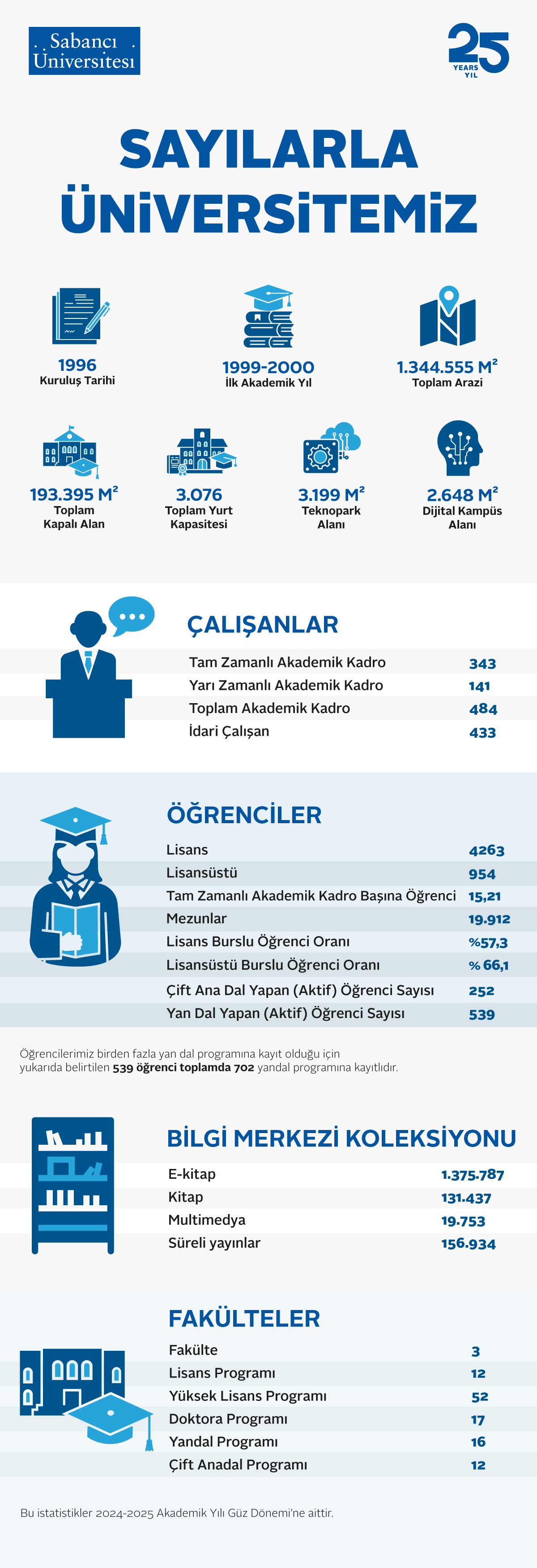 Sabancı Üniversitesi, Ekim 1999'da ilk öğrencilerini karşılayarak öğretime başladı. Üniversitemiz bugün Türkiye'de ve yurt dışında pek çok üniversite tarafından örnek alınmaktadır.