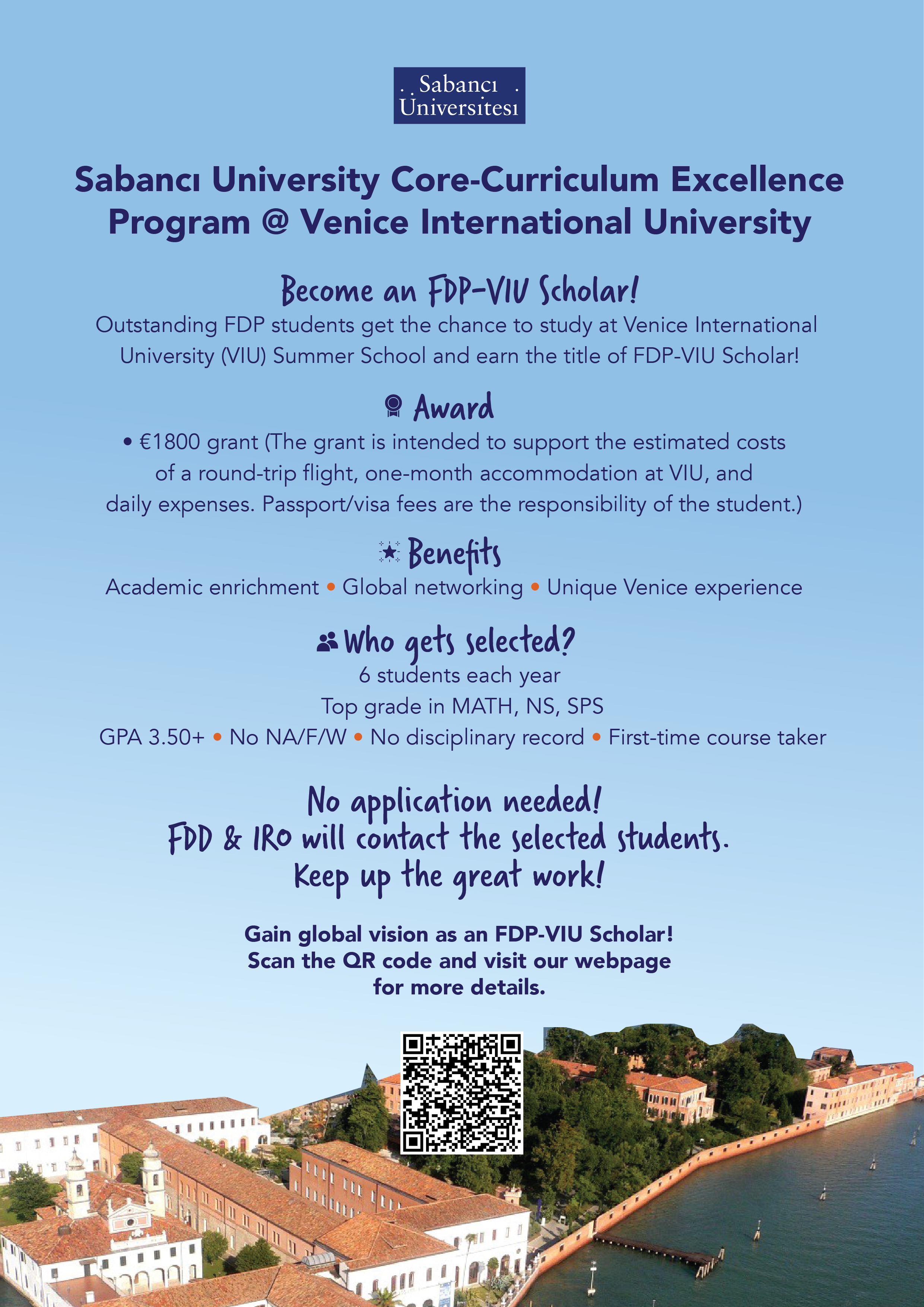 Outstanding students in the Foundations Development Program (FDP or Sabancı University Core Curriculum) will be recognized as FDP-VIU Scholarship students and awarded the opportunity to gain an early international experience at the VIU Summer School. Learn more about the eligibility requirements and selection process now!