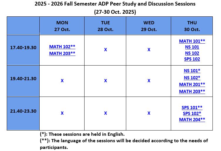 Academic Support Program (ADP/ASP), provides support and guidance in an enjoyable learning environment. The sessions are based on collaboration with your peers and aim to develop your critical thinking, communication, and study skills. You may attend the sessions to improve your academic success in MATH 101, MATH 102, MATH 201, MATH 203, MATH 204, NS 101, NS 102, SPS 101, and SPS 102 courses. Write to us at adp@sabanciuniv.edu for your special needs.