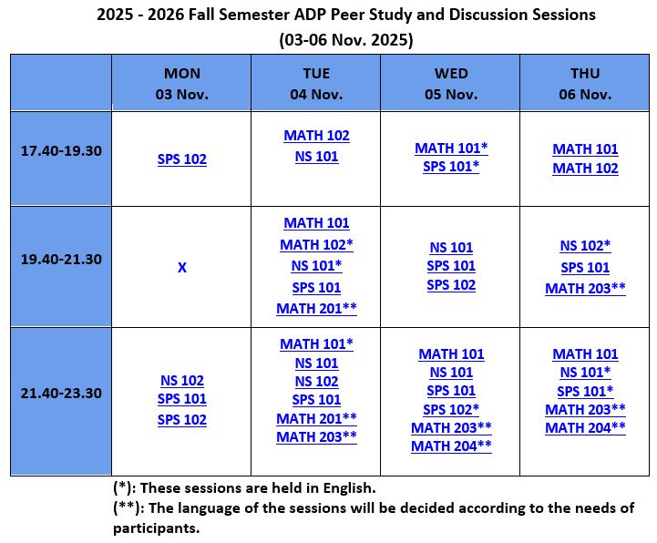 Academic Support Program (ADP/ASP), provides support and guidance in an enjoyable learning environment. The sessions are based on collaboration with your peers and aim to develop your critical thinking, communication, and study skills. You may attend the sessions to improve your academic success in MATH 101, MATH 102, MATH 201, MATH 203, MATH 204, NS 101, NS 102, SPS 101, and SPS 102 courses. Write to us at adp@sabanciuniv.edu for your special needs.