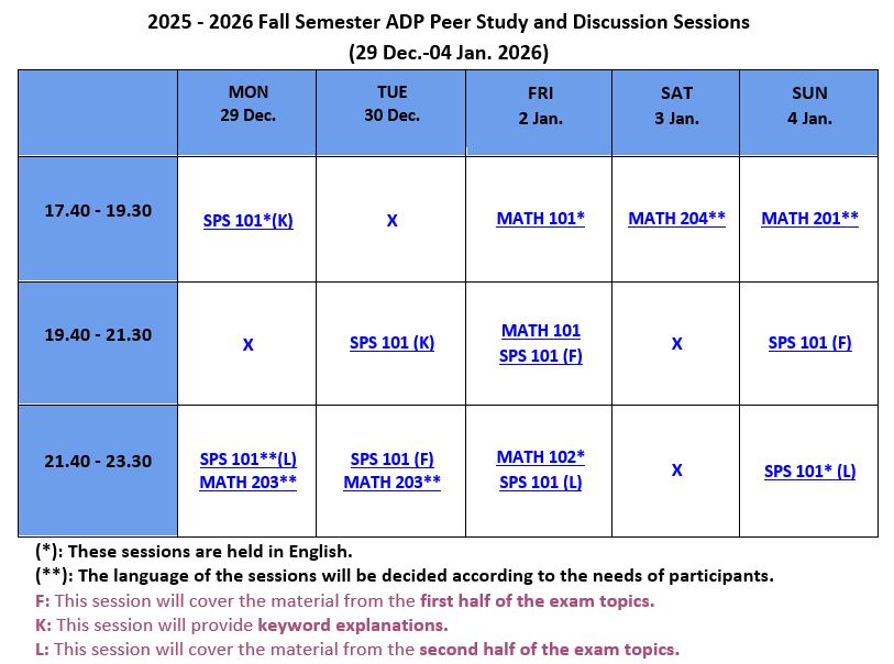 Academic Support Program (ADP/ASP), provides support and guidance in an enjoyable learning environment. The sessions are based on collaboration with your peers and aim to develop your critical thinking, communication, and study skills. You may attend the sessions to improve your academic success in MATH 101, MATH 102, MATH 201, MATH 203, MATH 204, NS 101, NS 102, SPS 101, and SPS 102 courses. Write to us at adp@sabanciuniv.edu for your special needs.