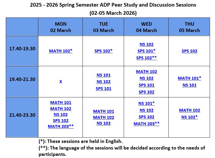 Academic Support Program (ADP/ASP), provides support and guidance in an enjoyable learning environment. The sessions are based on collaboration with your peers and aim to develop your critical thinking, communication, and study skills. You may attend the sessions to improve your academic success in MATH 101, MATH 102, MATH 201, MATH 203, MATH 204, NS 101, NS 102, SPS 101, and SPS 102 courses. Write to us at adp@sabanciuniv.edu for your special needs.