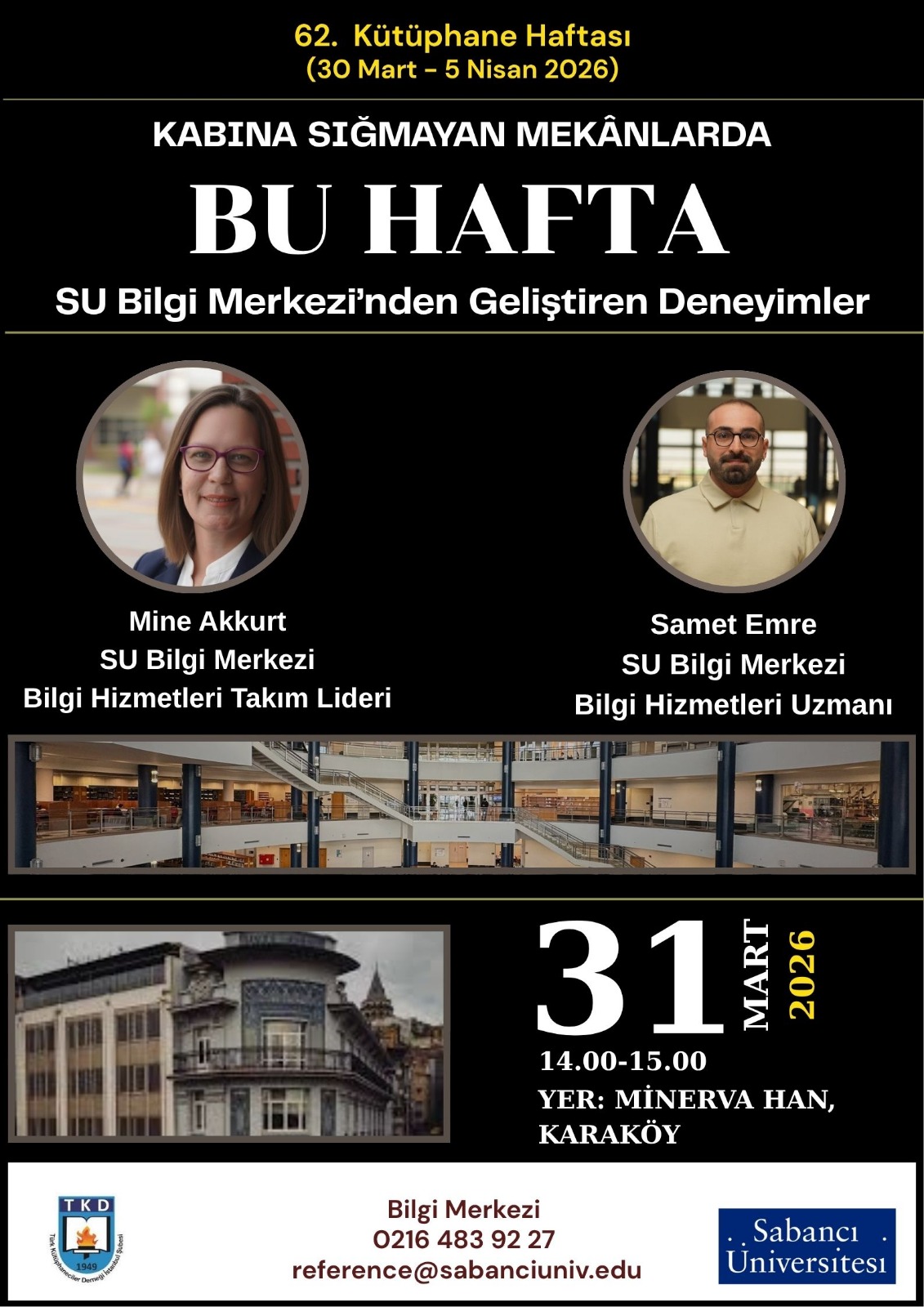 Bu yıl “İyileştiren Kütüphaneler Geliştiren Kütüphaneler” temasıyla gerçekleştirilecek olan 62. Kütüphane Haftası etkinlikleri kapsamında, "Kabına Sığmayan Mekânlarda Bu Hafta: SU Bilgi Merkezi'nden Geliştiren Deneyimler" başlıklı etkinliğimizde; kütüphanelerin bireysel iyi oluşu destekleyen, akademik ve entelektüel anlamda geliştirici alan ve hizmetler sunan rolleri ele alınacaktır.