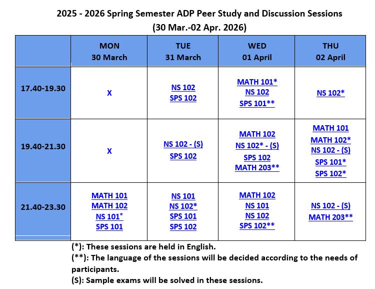 Academic Support Program (ADP/ASP), provides support and guidance in an enjoyable learning environment. The sessions are based on collaboration with your peers and aim to develop your critical thinking, communication, and study skills. You may attend the sessions to improve your academic success in MATH 101, MATH 102, MATH 201, MATH 203, MATH 204, NS 101, NS 102, SPS 101, and SPS 102 courses. Write to us at adp@sabanciuniv.edu for your special needs.