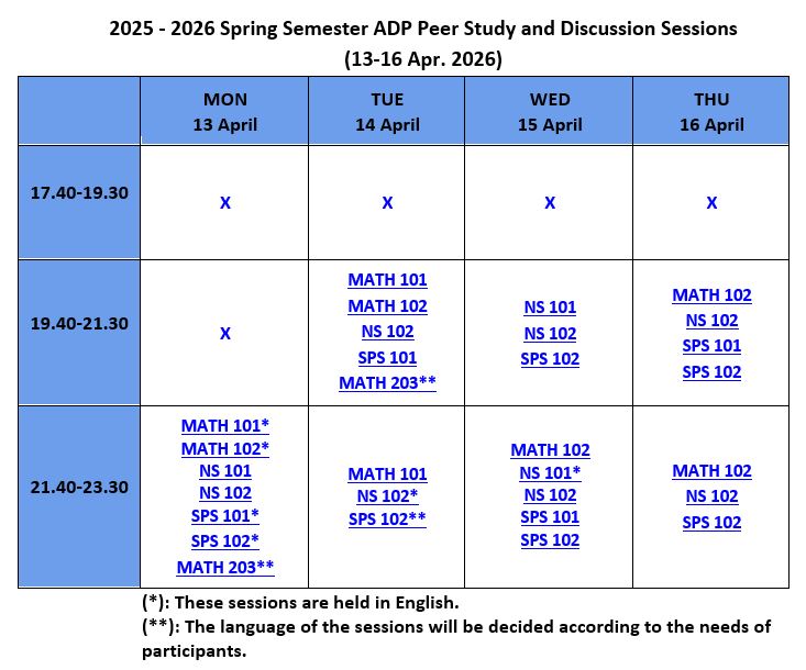 Academic Support Program (ADP/ASP), provides support and guidance in an enjoyable learning environment. The sessions are based on collaboration with your peers and aim to develop your critical thinking, communication, and study skills. You may attend the sessions to improve your academic success in MATH 101, MATH 102, MATH 201, MATH 203, MATH 204, NS 101, NS 102, SPS 101, and SPS 102 courses. Write to us at adp@sabanciuniv.edu for your special needs.
