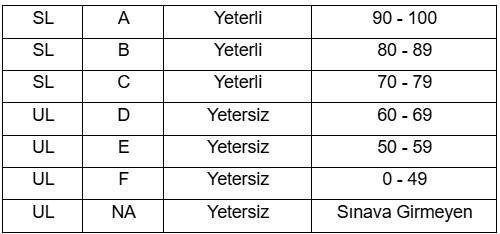 * Sadece ikinci aşama sınavı için SL ve UL harf notları baremlere ayrılır:
