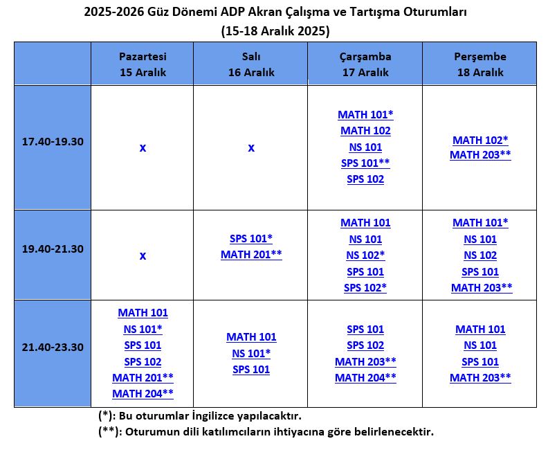 Akademik Destek Programı (ADP/ASP), öğrenme sürecini daha zevkli kılacak, çalışma veriminizi ve başarınızı arttırmaya yönelik oturumlar düzenler. Bu oturumlar, akran dayanışması prensibine dayanır ve eleştirel düşünme, iletişim ve çalışma becerilerinizi geliştirmeyi amaçlar. MATH 101, MATH 102, MATH 201, MATH 203, MATH 204, NS 101, NS 102, SPS 101 ve SPS 102 derslerindeki akademik başarınızı arttırmak için oturumlarımıza katılabilirsiniz.