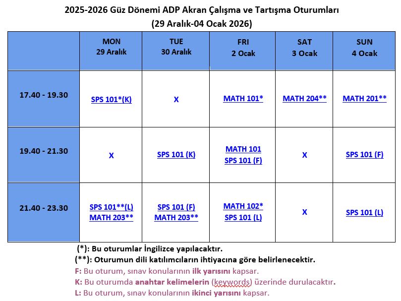 Akademik Destek Programı (ADP/ASP), öğrenme sürecini daha zevkli kılacak, çalışma veriminizi ve başarınızı arttırmaya yönelik oturumlar düzenler. Bu oturumlar, akran dayanışması prensibine dayanır ve eleştirel düşünme, iletişim ve çalışma becerilerinizi geliştirmeyi amaçlar. MATH 101, MATH 102, MATH 201, MATH 203, MATH 204, NS 101, NS 102, SPS 101 ve SPS 102 derslerindeki akademik başarınızı arttırmak için oturumlarımıza katılabilirsiniz.