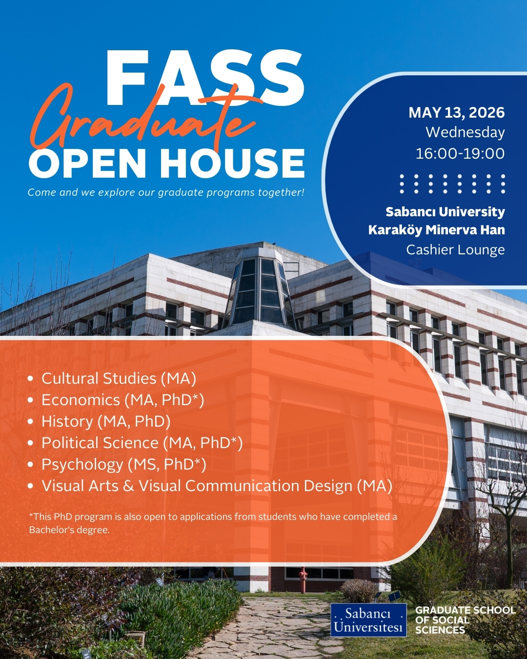 Sabancı University Sosyal Bilimler Enstitüsü yüksek lisans ve doktora programlarını yakından tanımak isteyen herkesi FASS Graduate Open House etkinliğimize bekliyoruz. Programlarımız hakkında bilgi almak, akademisyenlerimiz ve öğrencilerimizle tanışmak için bize katılın.