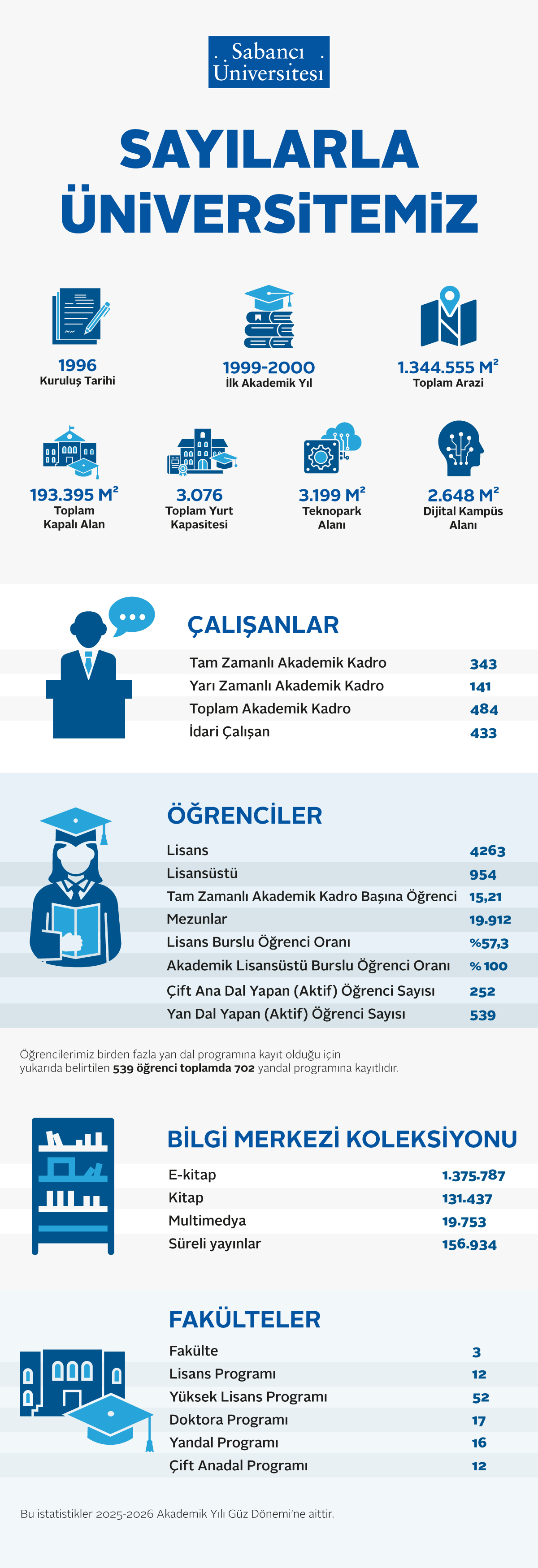 Sabancı Üniversitesi, Ekim 1999'da ilk öğrencilerini karşılayarak öğretime başladı. Üniversitemiz bugün Türkiye'de ve yurt dışında pek çok üniversite tarafından örnek alınmaktadır.